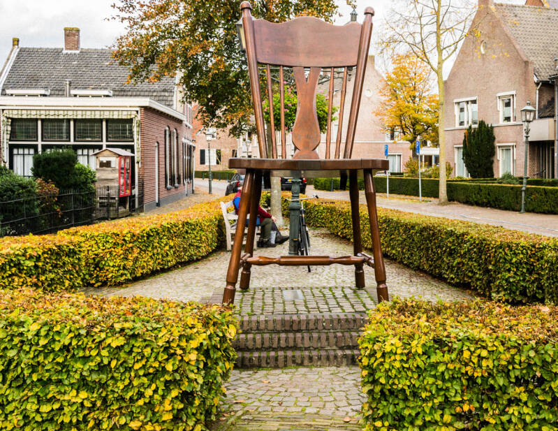 Opeens kom je in Oirschot, even buiten het centrum, deze houten stoel tegen. Het is de grootste houten stoel in Europa. Het is een eerbewijs aan het vakmanschap van de Oirschotse meubelindustrie. Het is een Amerikaanse knopstoel.