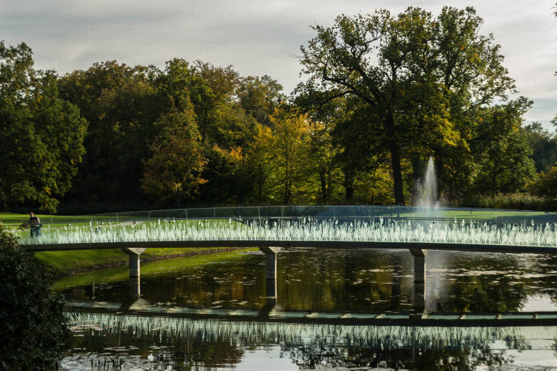 De glazen brug in de Engelse landschapstuin.