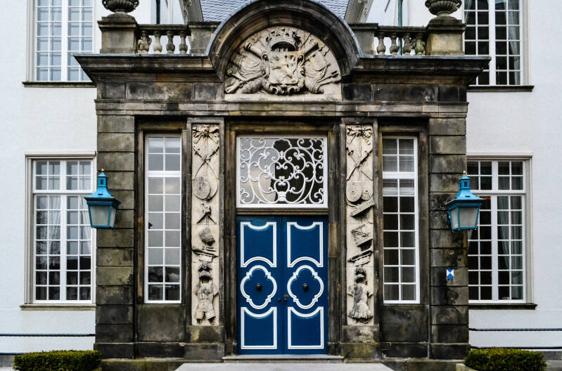 Deze rijk gedecoreerde deur is de deur van het oude gemeentehuis, direct naast de Walburgiskerk.