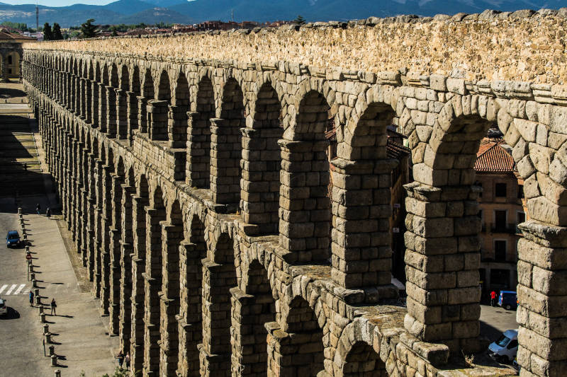 Segovia, Spanje, het aquaduct. Dit aquaduct staat midden in de stad. Het is een Romeins aquaduct, dat waarschijnlijk dateert uit het begin van de 2e eeuw. Het is een indrukwekkende constructie die uit 2 rijen bogen bestaat.