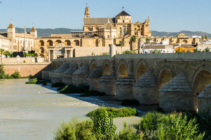 Cordoba. Deze brug leidt naar de beroemde Mezquita in Cordoba. Een kathedraal met zowel Rooms katholieke als Moorse delen. (voor meer zie mijn website www.metdecamperopweg.nl reis naar Andalusie.