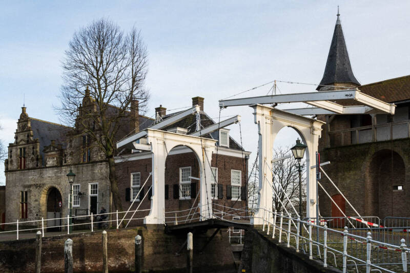 BDe brug die toegang geeft tot de museumhaven in Zierikzee is ook een ophaalbrug. Rechts is de brug in de context te zien met klinks de stadszij met renaissancegevel.