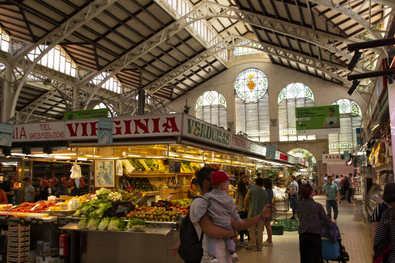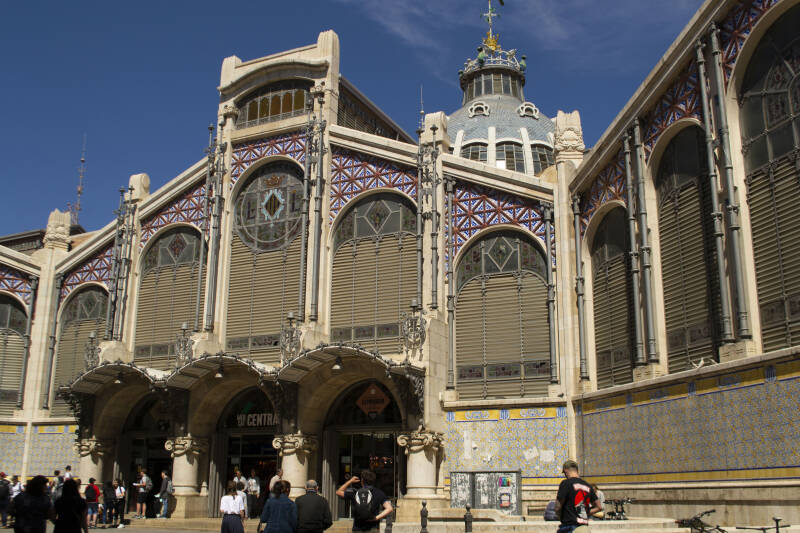 Le Mercado central, de markthal. Ook in Art Nouveaustijl te zien aan de ornamenten boven de ingang, aan de pilaren bij de ingang en aan de koepel.