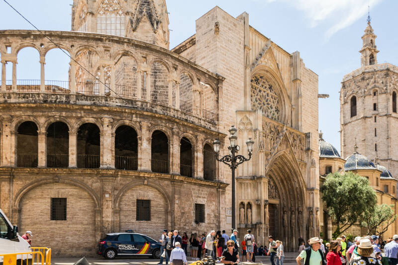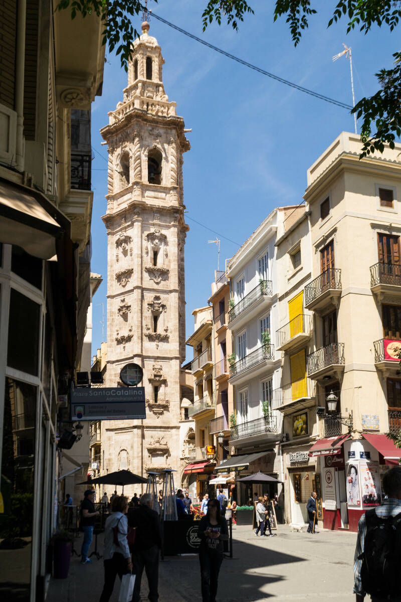Links de toren van de Iglesia de Santa Caterina met de mooiste klokkentoren van Spanje. Rechts de toren van de kathedraal van Valencia, La Seu.