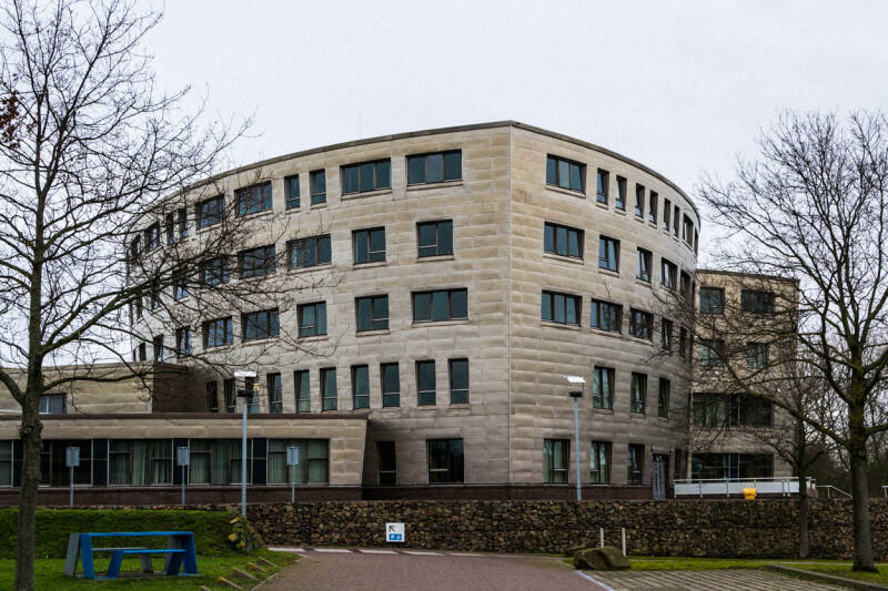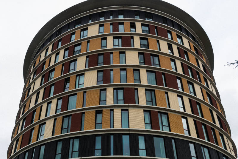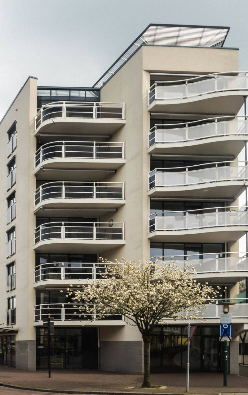 Appartementsgebouw aan de rand van de binnenstad van Deventer. De welvingen in de balkons zijn opvallend.