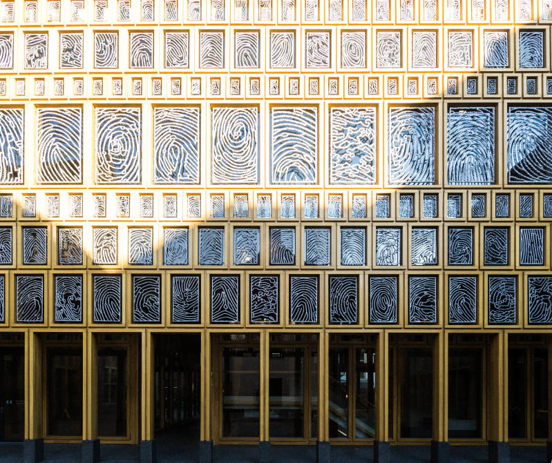 Het nieuwe gemeentehuis in Deventer. In 2013 werd dit deel ontworpen als uitbreiding van het oude gemeentehuis. Het werd ontworpen door de architecten Jan Willem Neutelings en Michiel Riedijk. Kunstenaar Loes ten Anscher ontwierp het raamwerk bestaande uit 2.246 vingerafdrukken van inwoners van Deventer.