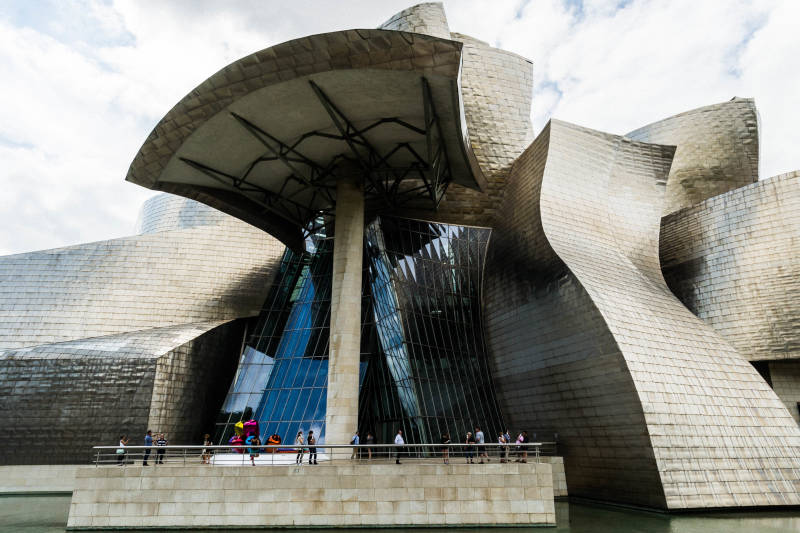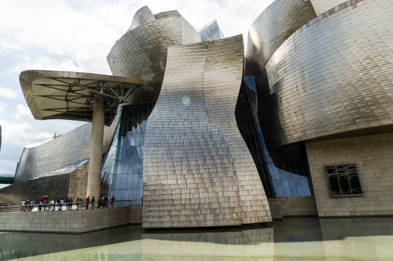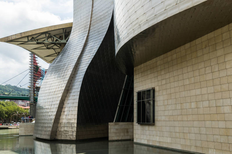 het Guggenheimmuseum in Bilbao. Het gebouw op zich is een museumstuk door zijn deconstructivistische architectuur. Deze stijl heeft als opvatting dat de maatschappij verwarrend en onzeker is. Dat wil men ook in de bouwstijl laten zien. Het gebouw is ontworpen door Frank Gehry en bestaat uit titaniumschubben.