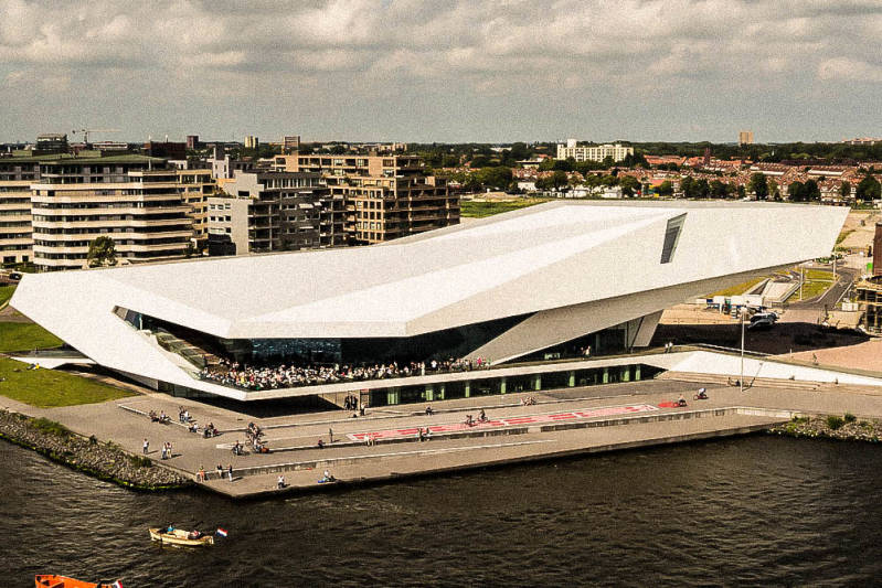 Het Eye filmmuseum in Amsterdam aan het IJ. Het gebouw is in 2012 geopend. Het is ontworpen door het Weense bureau Delugan Meissl Associated Architects. De ontwerpers hebben zich laten inspireren door de thema's film en architectuur. Met een constructie bestaand uit meer dan duizend ton futuristisch gebogen staal dat aan alle kanten uitsteekt is het een echte "Eye catcher".
